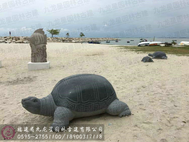 前年農歷七月開始,海珠嶼大伯公廟這塊靠山臨海,占地10萬多方尺之地,經過短短一年的人工美化,廟旁沙灘栽種一排排駿馬、靈鹿、孔雀、鳳凰等飛禽走獸的造型盆景,游客穿梭在植物走道弄潮看夕陽。沙灘上豎立起海龍王、蝦兵蟹將及石龜等石雕笑瞇瞇與游客合照。來自中國惠安九龍星園林古建陳沂泉先生承包并制作該石雕工程項目。